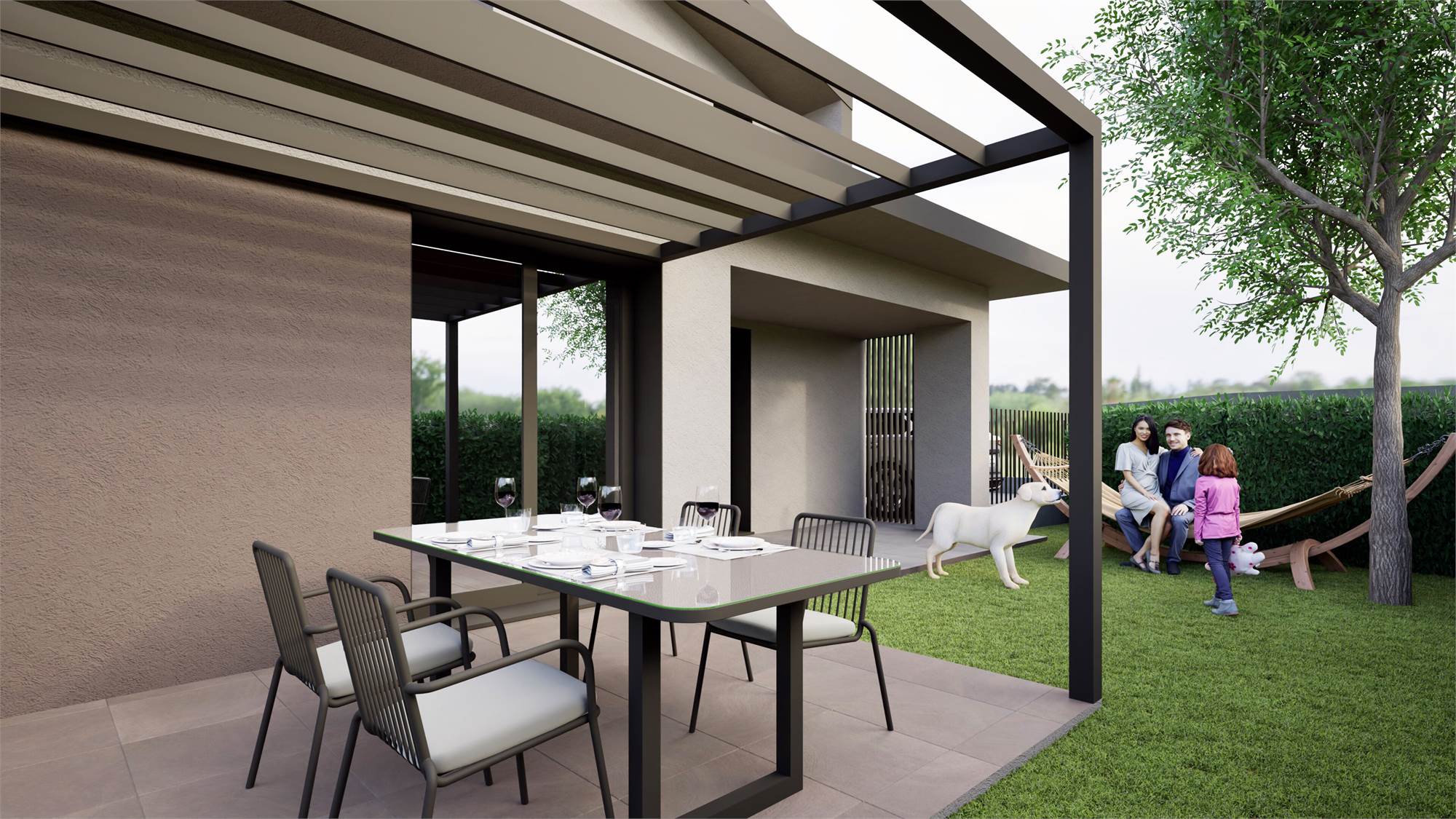 L’ingresso conduce a una luminosa zona giorno openspace con cucina, zona pranzo e salotto, con affaccio diretto sul giardino privato, uno spazio pensato per essere vissuto in ogni stagione, perfetto per momenti di relax o convivialità.